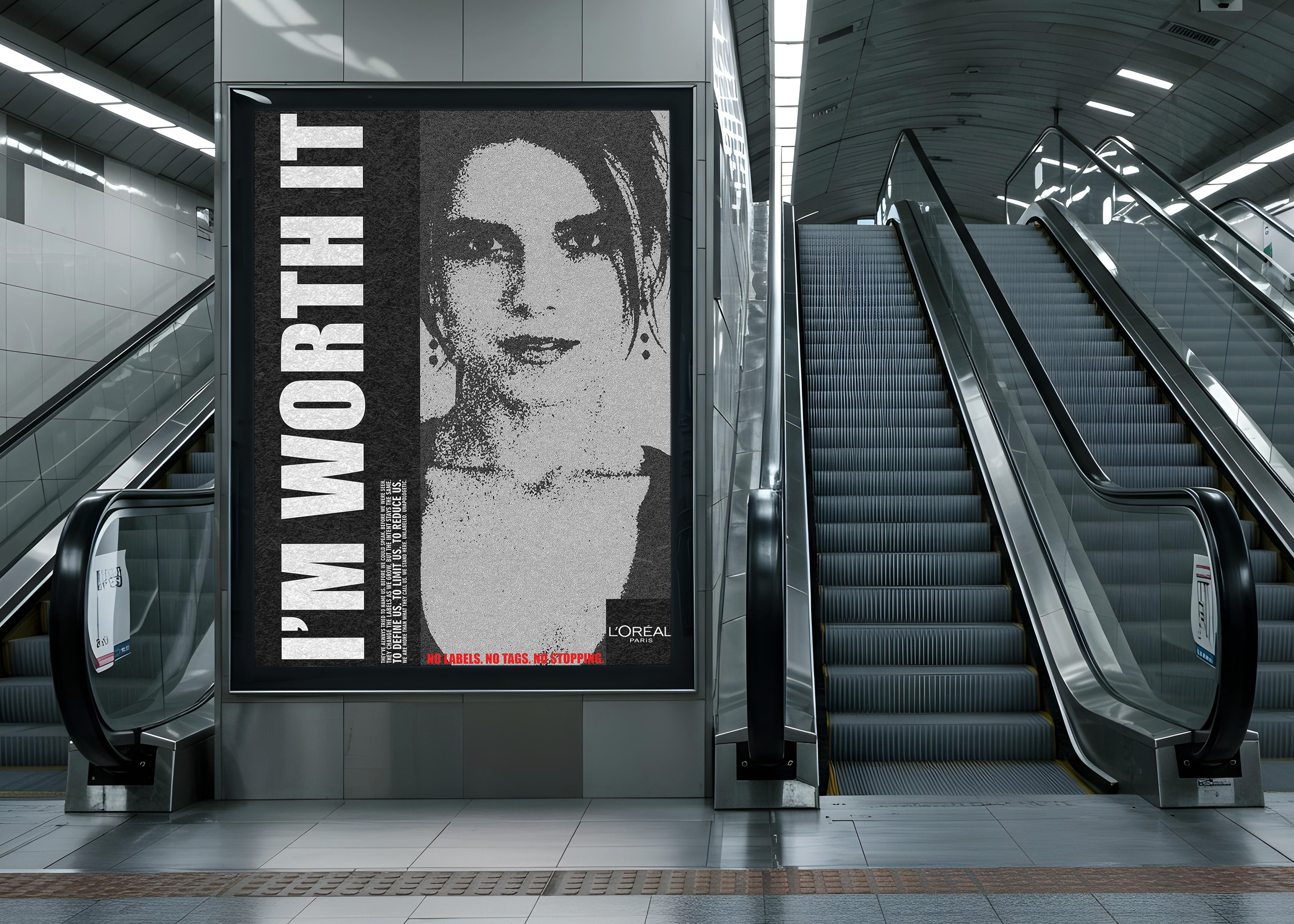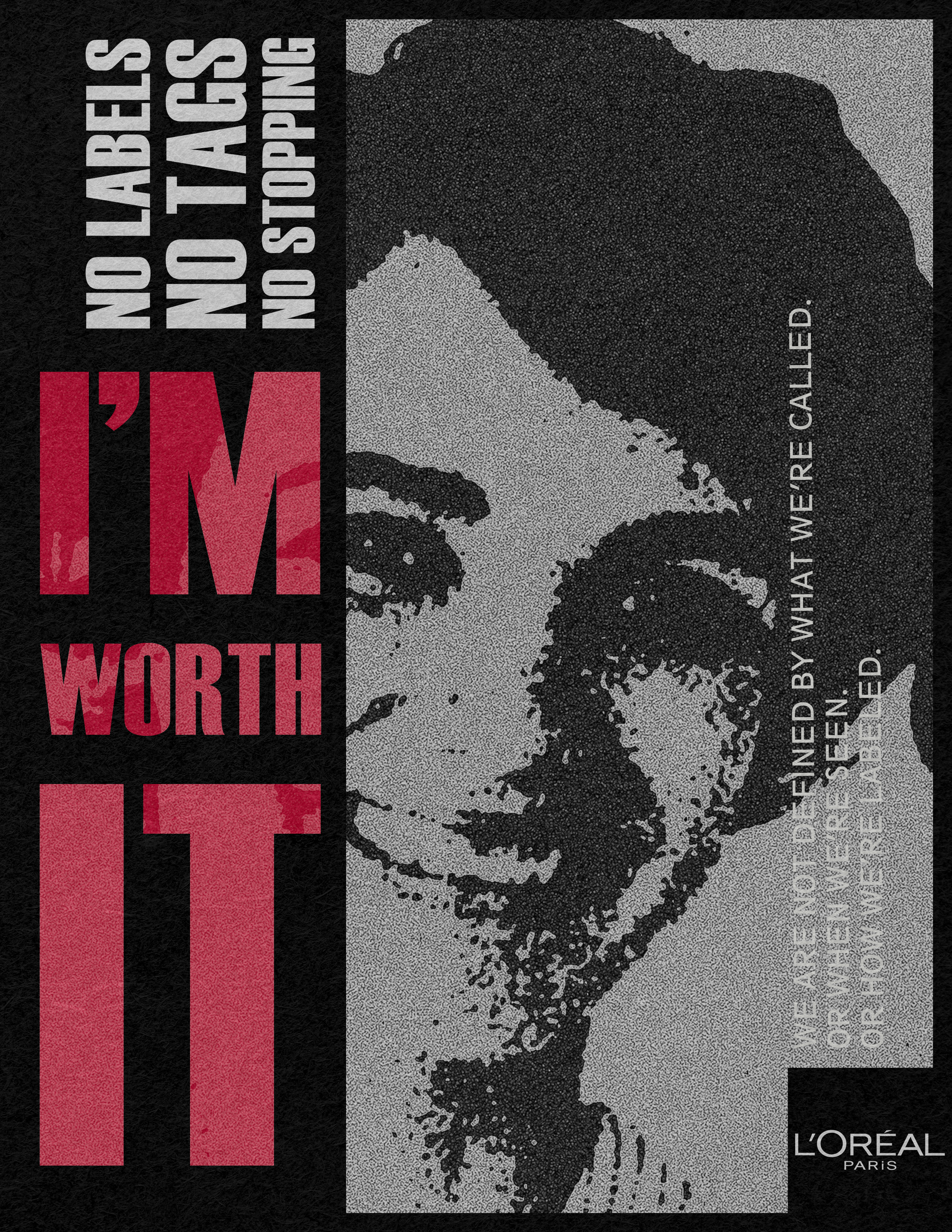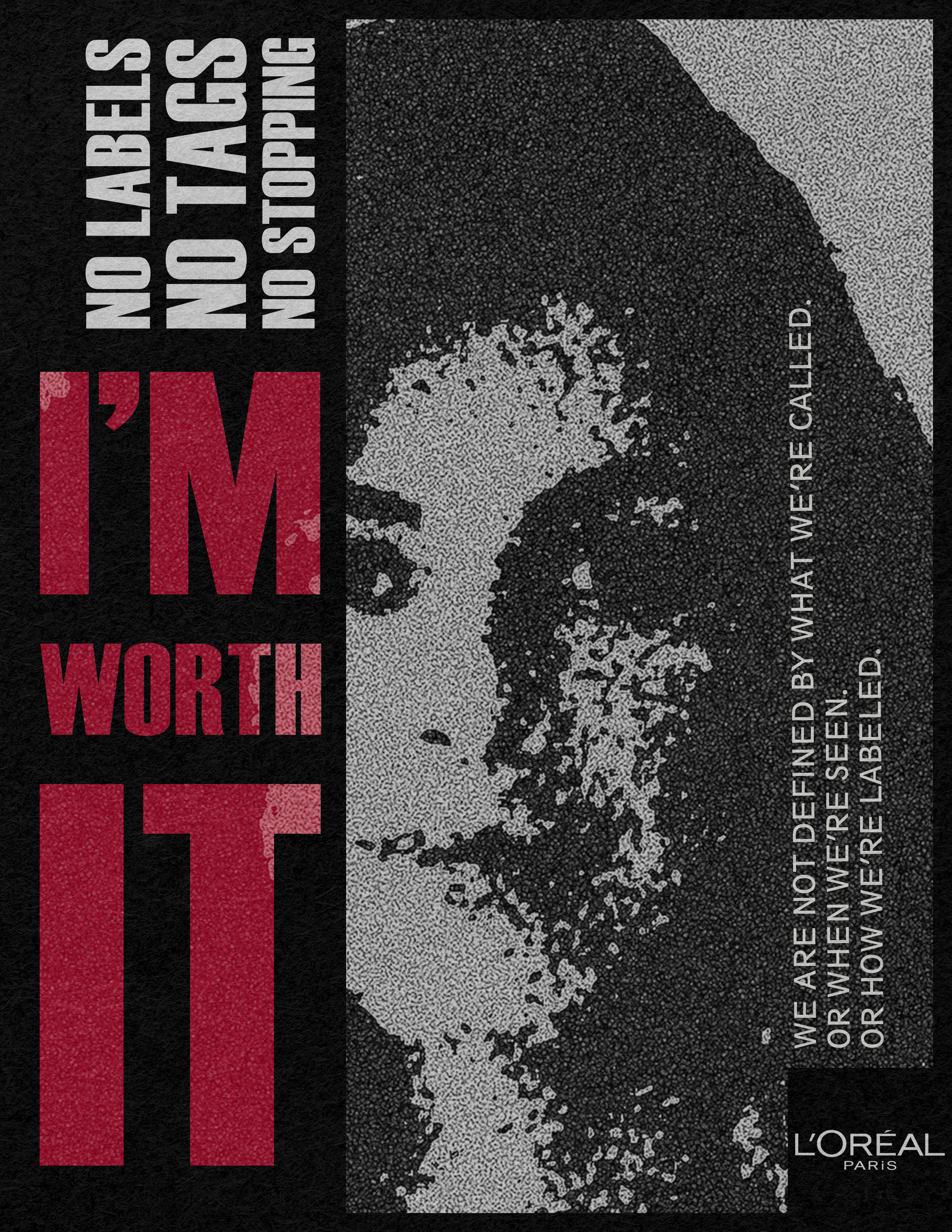 The Task? Create a campaign that draws from the radical meaning of ‘I’m worth it’, highlighting beauty as a powerful lever to elevate the role of women in modern society. The ‘Not a label’ campaign focuses on tackling the issue of tags given to emerging women to limit their progress. We do it by denying them. Just one bold thought in mind; I’M WORTH IT. No labels. No tags. No stopping!