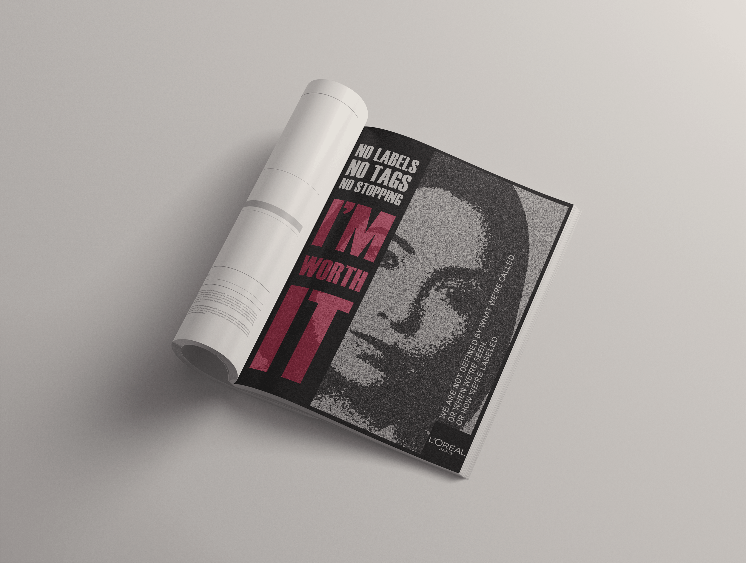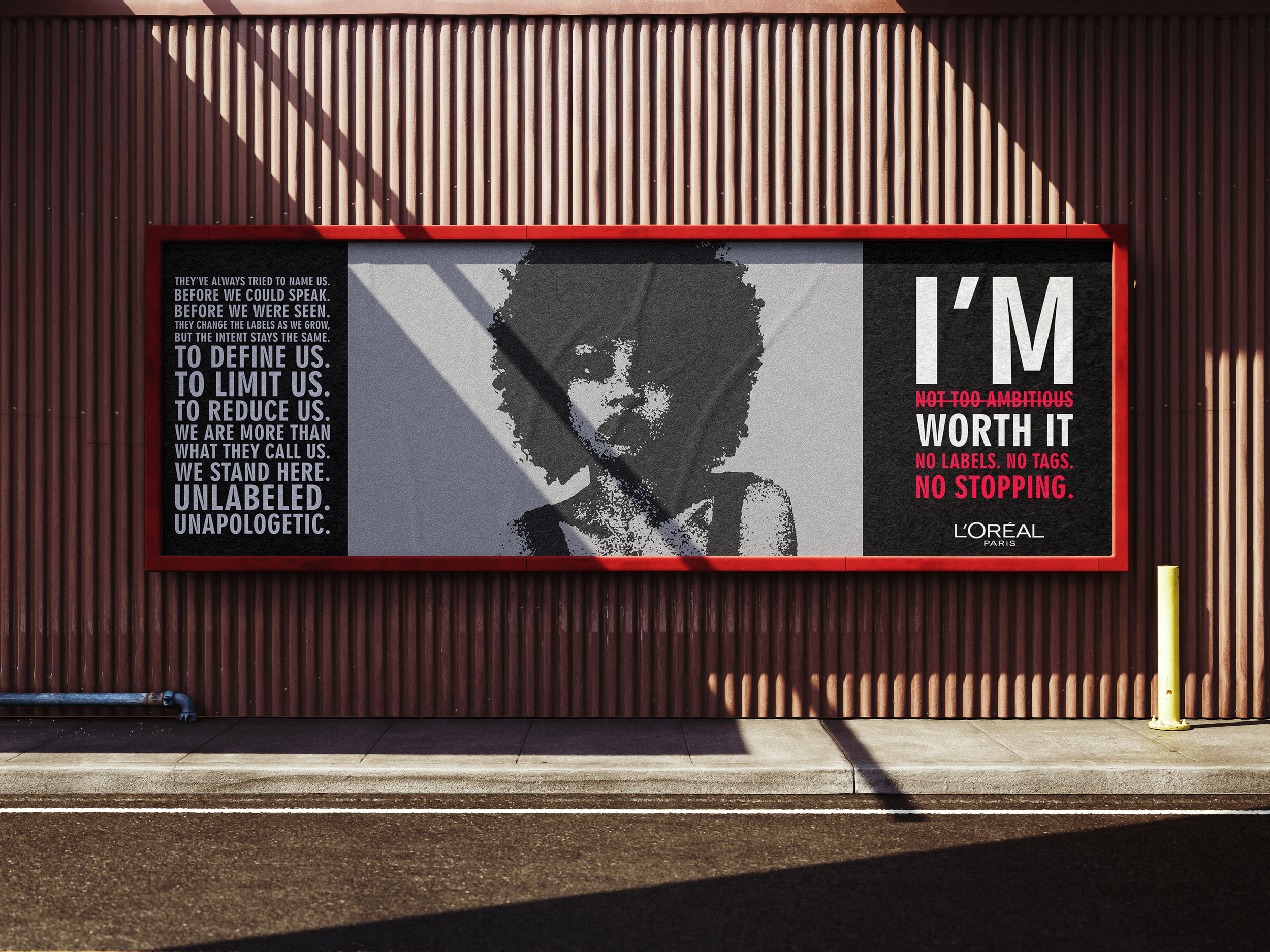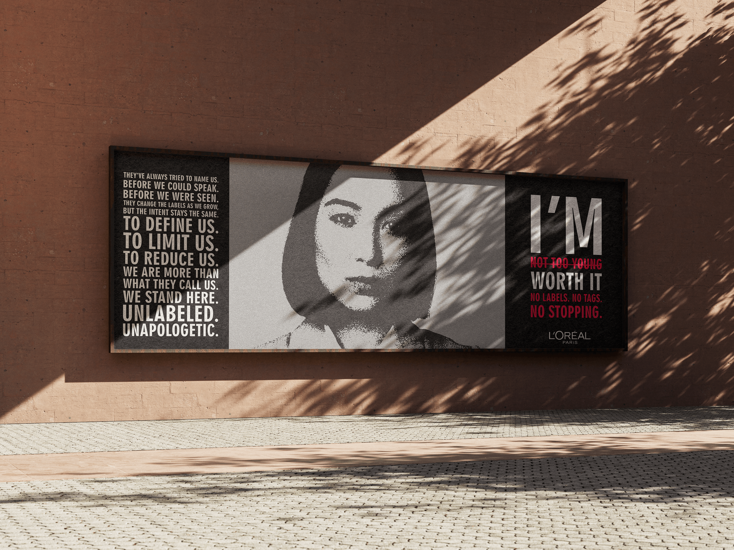 The Task? Create a campaign that draws from the radical meaning of ‘I’m worth it’, highlighting beauty as a powerful lever to elevate the role of women in modern society. The ‘Not a label’ campaign focuses on tackling the issue of tags given to emerging women to limit their progress. We do it by denying them. Just one bold thought in mind; I’M WORTH IT. No labels. No tags. No stopping!